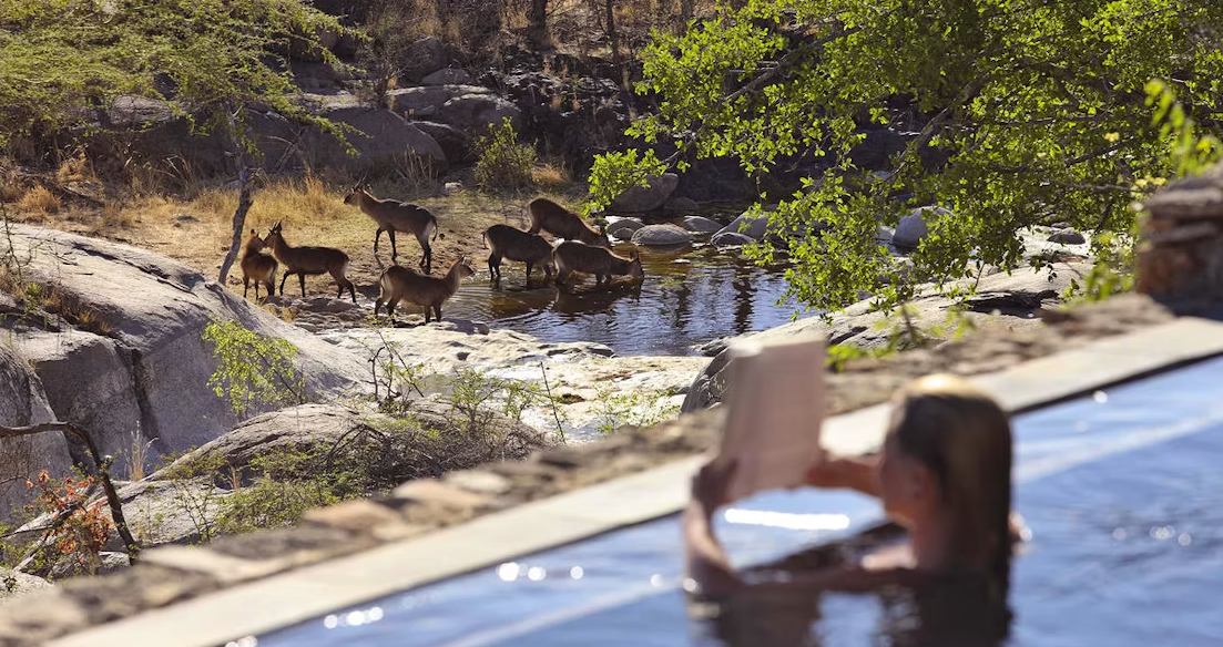 Situated in the heart of the Serengeti, Four Seasons Safari Lodge offers elevated accommodations with direct views of a bustling animal watering hole.